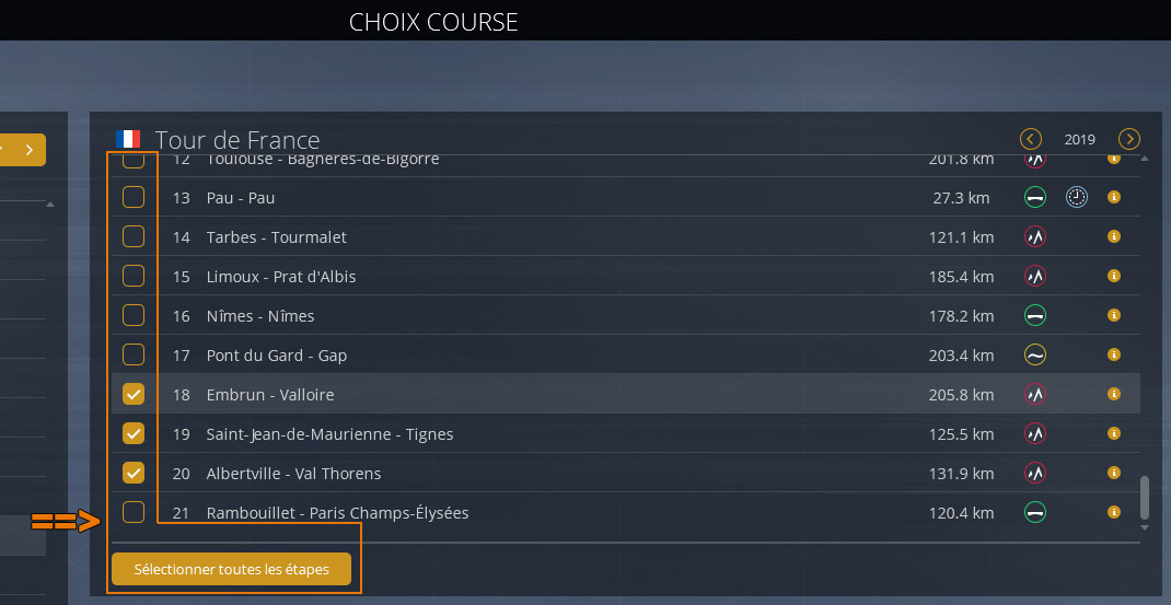 If you select a tour, you can choose the number of stages, as you want, by using the buttons at the centre with the list of stages: