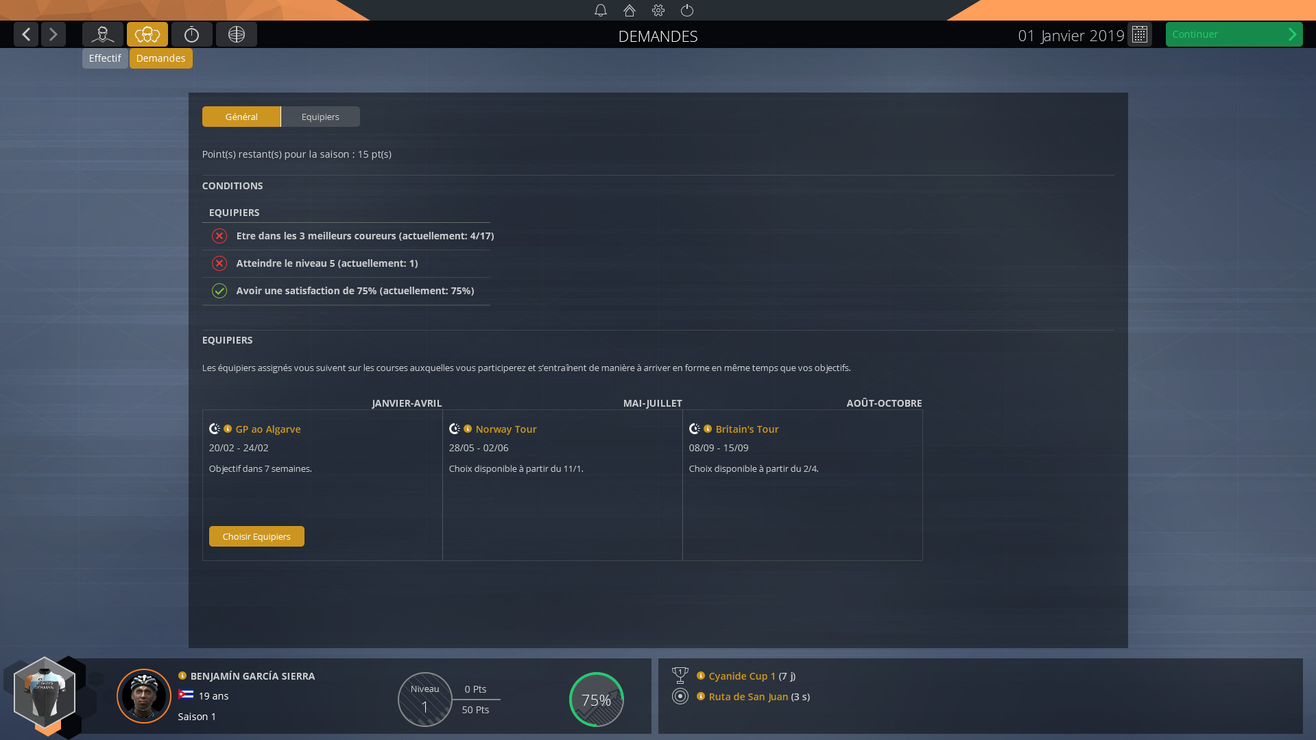 By drawing attention to yourself by your performances and by achieving the objectives set by your manager, you will earn the chance to become a leader within your team. This will allow you to have team-mates with you during races, supporting you all the way to victory. You can thus control them, to some extent during races in order to, for example, set up a sprint train in front of your rider or to protect you inside the peloton. Being a leader also allows you to choose you preferred team-mates for a race, under certain conditions: Requests for team-mates works on the same points system as requests for race registrations. It is thus essential that you do not spend all of your season points in one go!